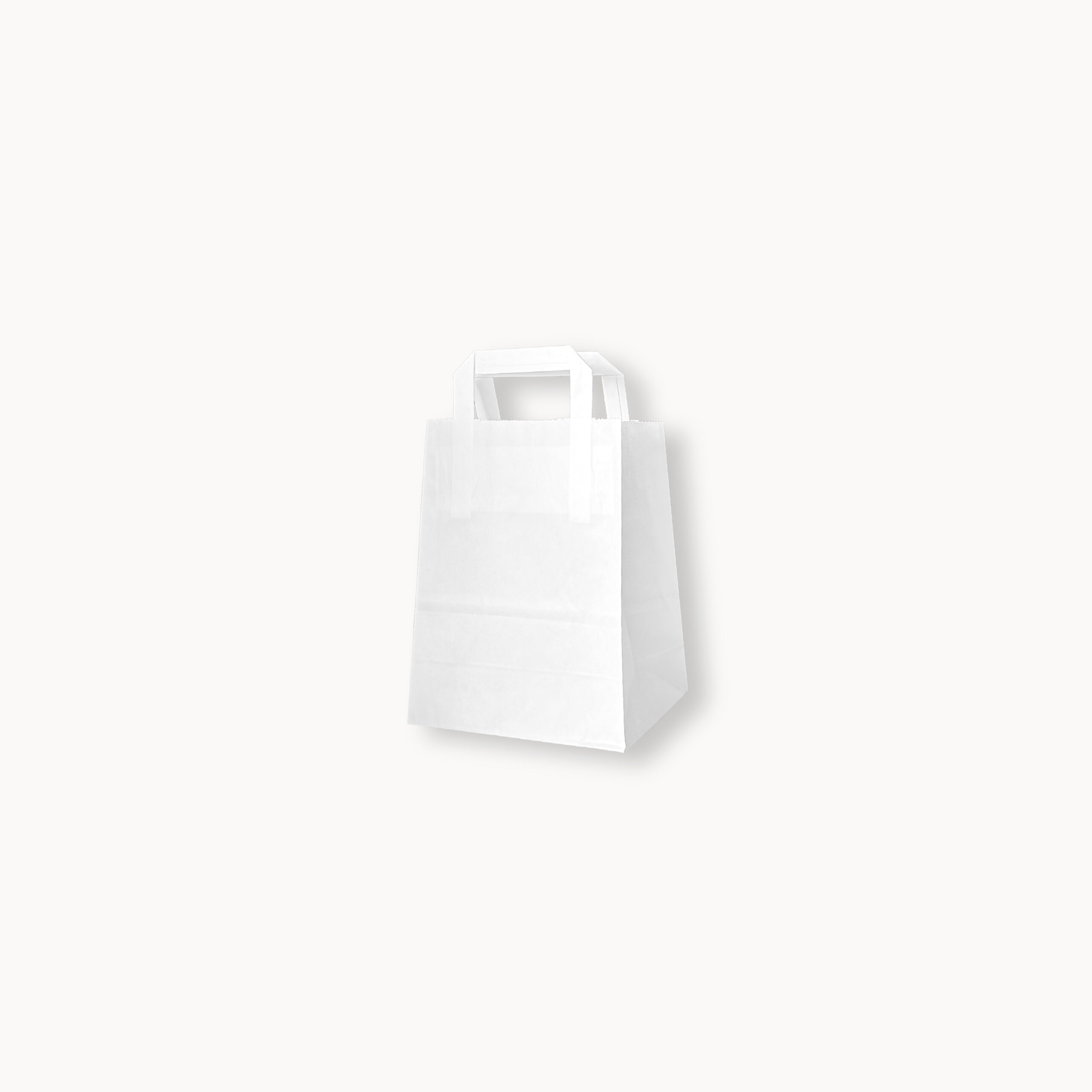 Fabricada con papel blanco reciclado de alta calidad y certificación ecológica internacional, esta bolsa ofrece una base firme y asas planas que garantizan una experiencia de empaque funcional, ligera y profesional.